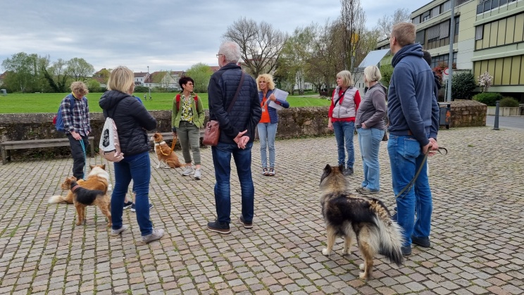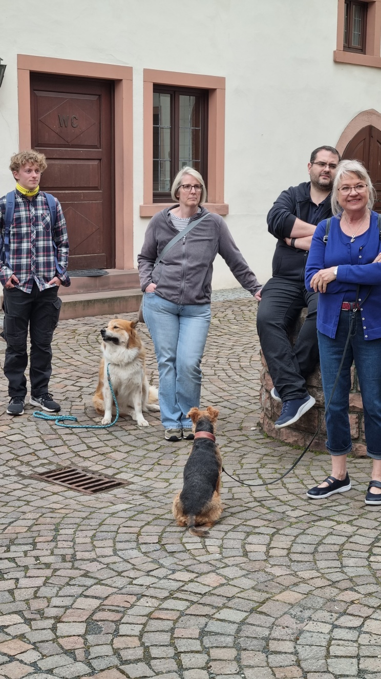 Am Samstag, den 22.04.2023, versammelte sich das Trainerteam des IRJGV Barbarossa um 16 Uhr auf dem Obermarkt in Gelnhausen. Nachdem unsere liebe Sabine zu Beginn des Jahres den Vorstandsposten unserer Ortsgruppe abgelegt hatte, hieß es, sich noch einmal herzlich und angemessen bei ihr für die jahrelange Vorstandstätigkeit zu bedanken. Aus diesem Grund unternahmen wir eine Stadtführung in Gelnhausen, aber natürlich keine „normale“ Stadtführung. Wie sich das gehört, durften an diesem Tag alle unsere Hunde mit dabei sein. Die ca. zweistündige Tour führte uns vom Obermarkt über das Holztor und den Brunnen zur Marienkirche. Durch kleine Gässchen ging es weiter zum Hexenturm, der Müllerwiese und anschließend zur Kaiserpfalz. Neben all den schönen Orten stand das Motto „Redensarten“ im Fokus der Führung. Unsere Stadtführerin, Frau Groth, hatte viele spannende und interessante Infos in ihrem Repertoire, sodass keine Langeweile aufkam und die Zeit nur so verflog. Einiges davon mussten wir uns wirklich „hinter die Ohren schreiben“, um es nicht so schnell wieder zu vergessen. Damit wir im Anschluss an die Tour den „Gürtel nicht enger schnallen mussten“, ließen wir den Abend „mit Kind und Kegel“ in der Pizzeria „Zum Paradies“ bei Pizza, Pasta und dem ein oder anderen Kaltgetränk gemütlich ausklingen. Wir bedanken uns herzlich bei Sabine Sauermann für ihre sehr engagierte und langjährige Vorstandstätigkeit und bei Frau Groth, die sich auf das Abenteuer Stadtführung mit Hunden eingelassen und unsere Führung begleitet hat. Es war ein super Ereignis.